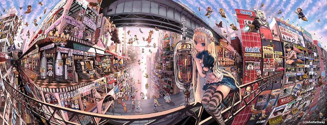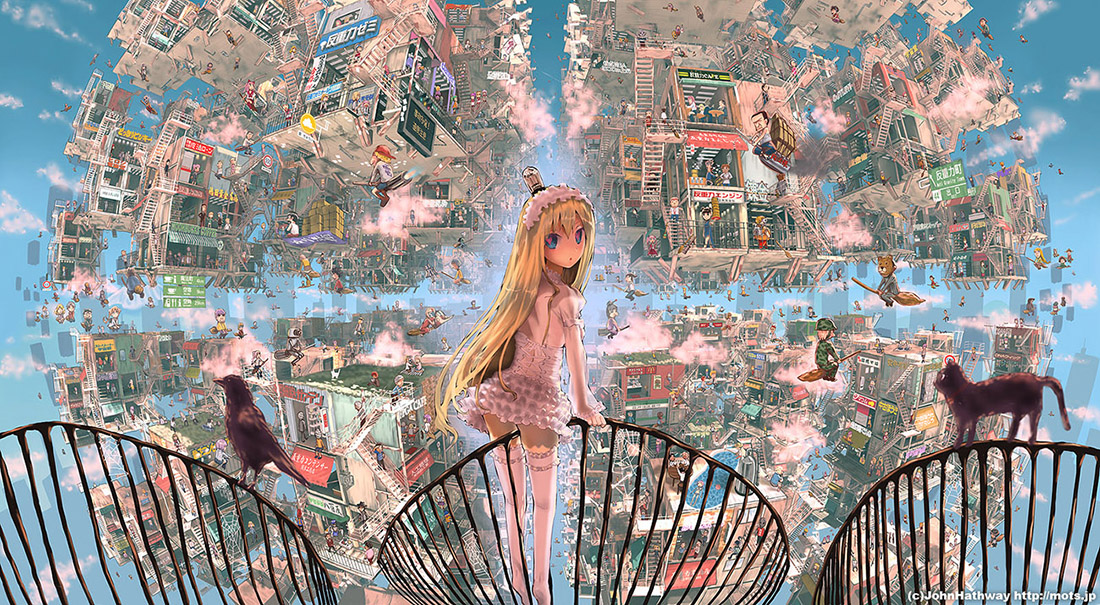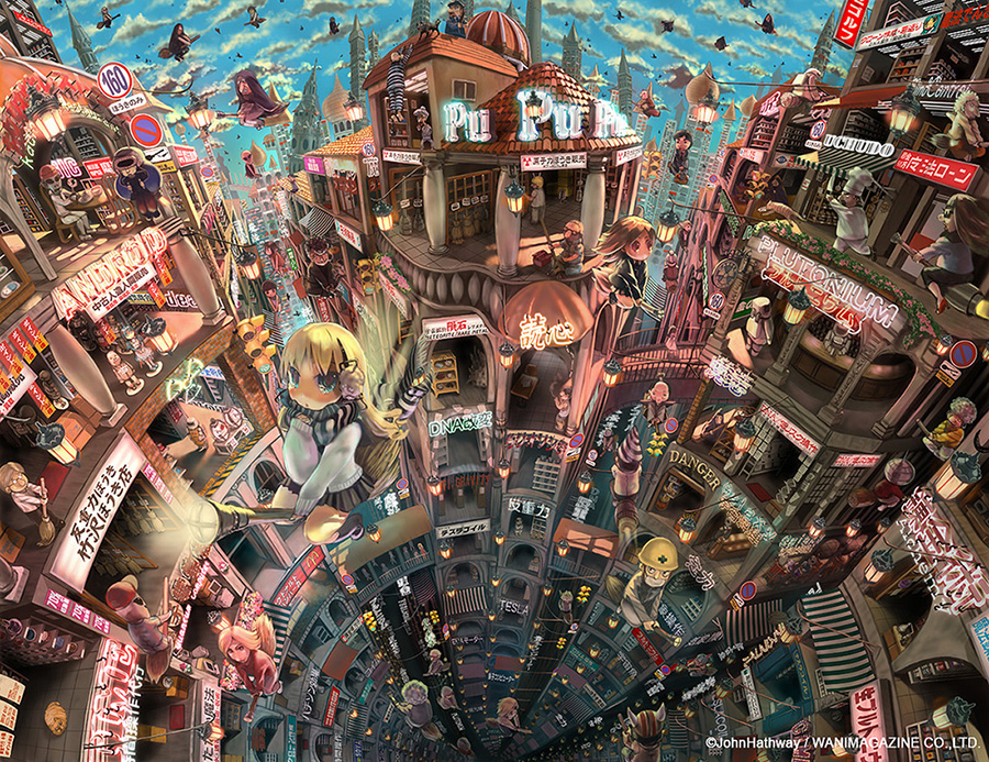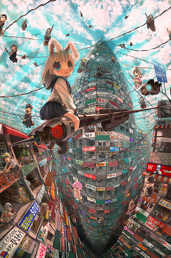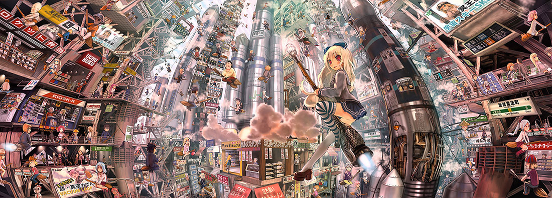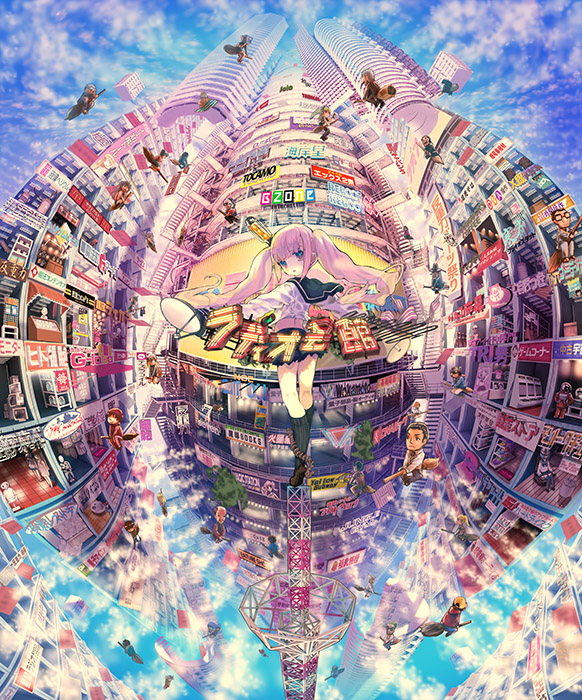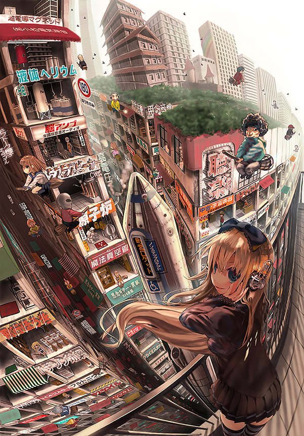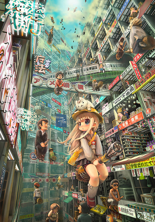In this world, moral physics progressed with future, and it is the world (Tokyo) where the technology which can amplify will was established, and it became possible to move oneself in the height direction because the equipment in a broom amplifies will. If movement of the height direction is possible, a city will develop in three dimensions. The concept of the first floor of a building and other stories is lost, and the surface of all the buildings becomes an entrance. The signboard can exist now also in a high class.